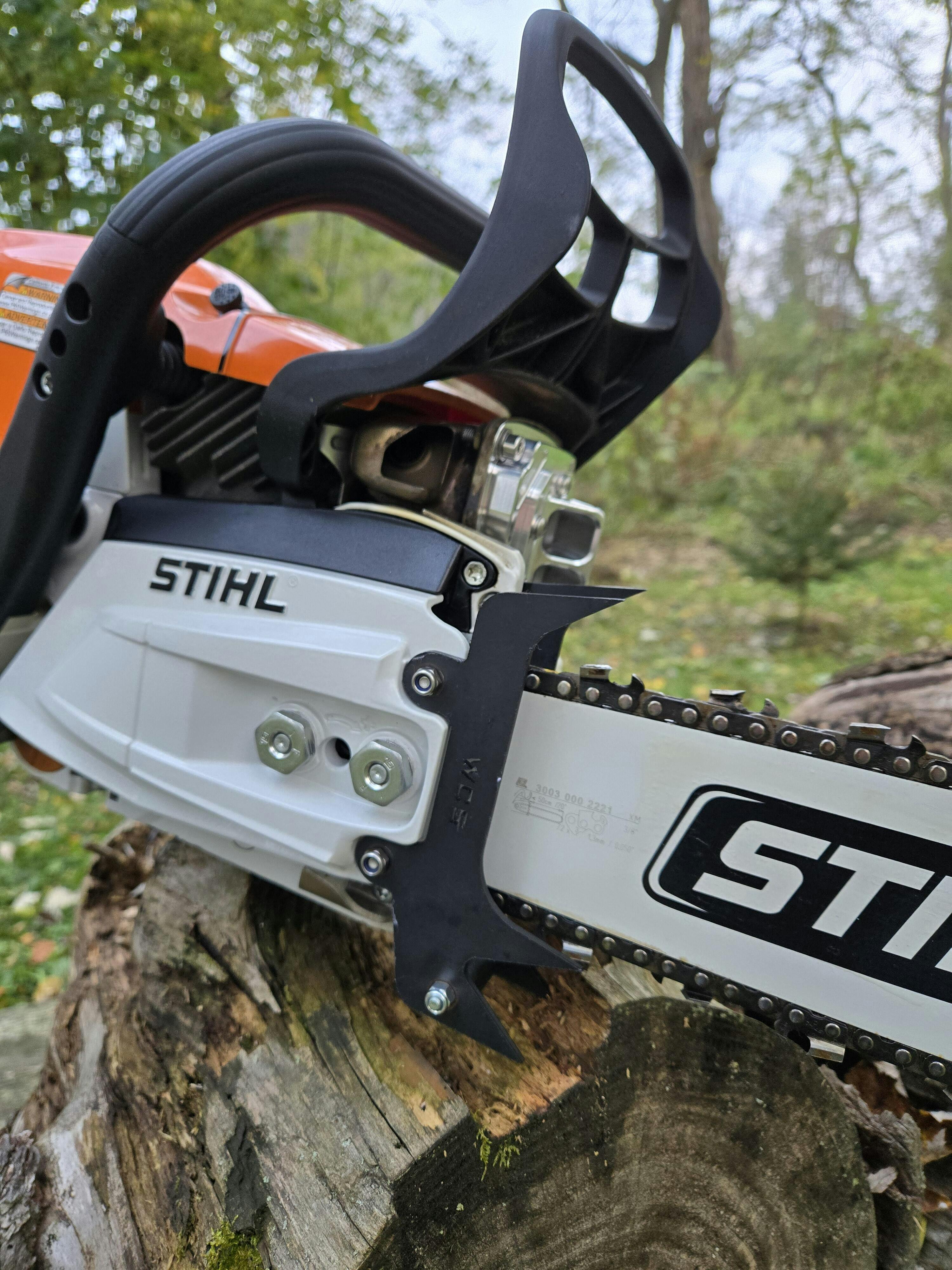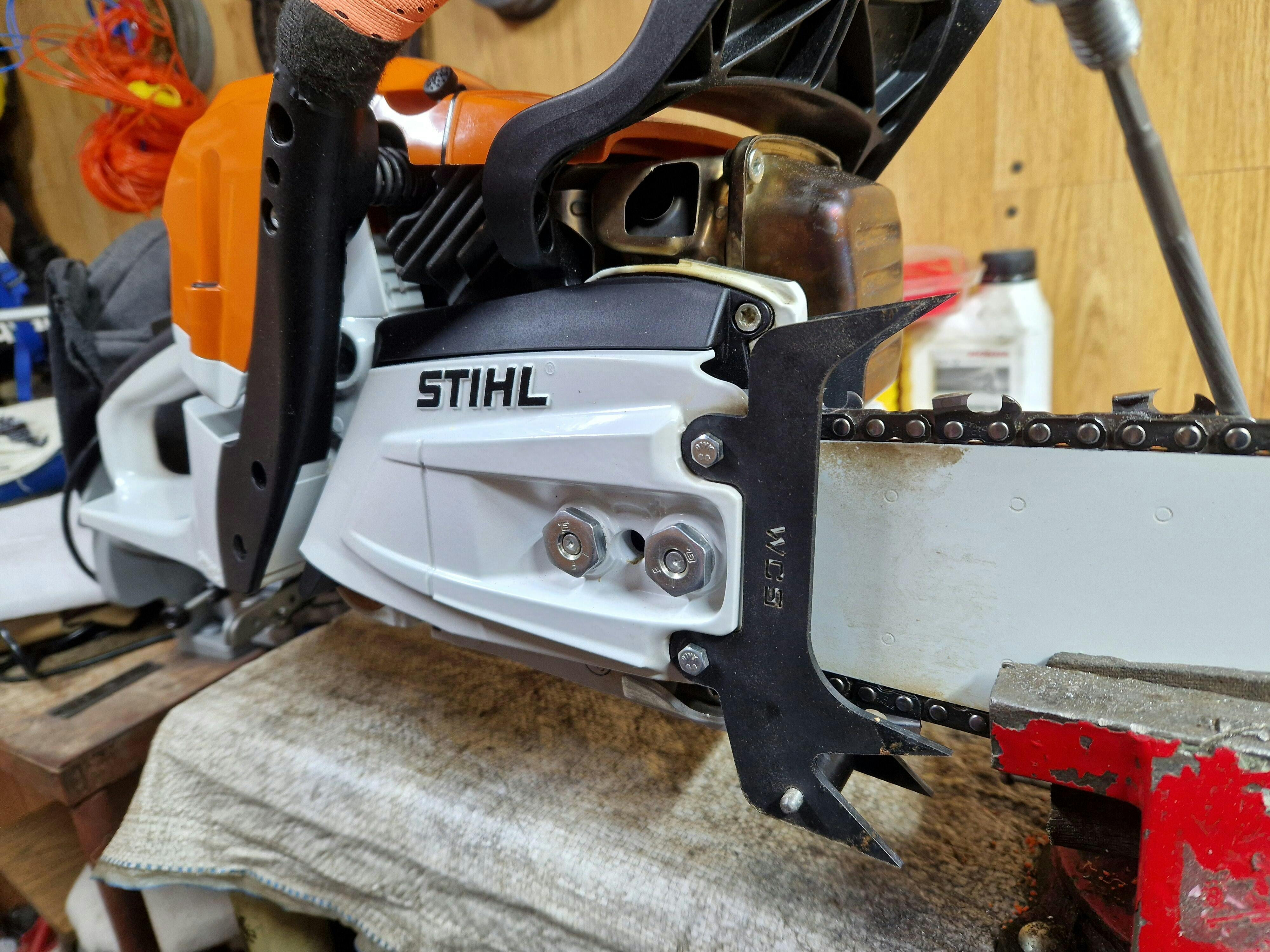 Stihl® Models include an inside and outside spike. Reuse your existing hardware if you have dual spikes on your stock saw, or purchase our Felling Dog Hardware and Chain Roller/Catcher here.