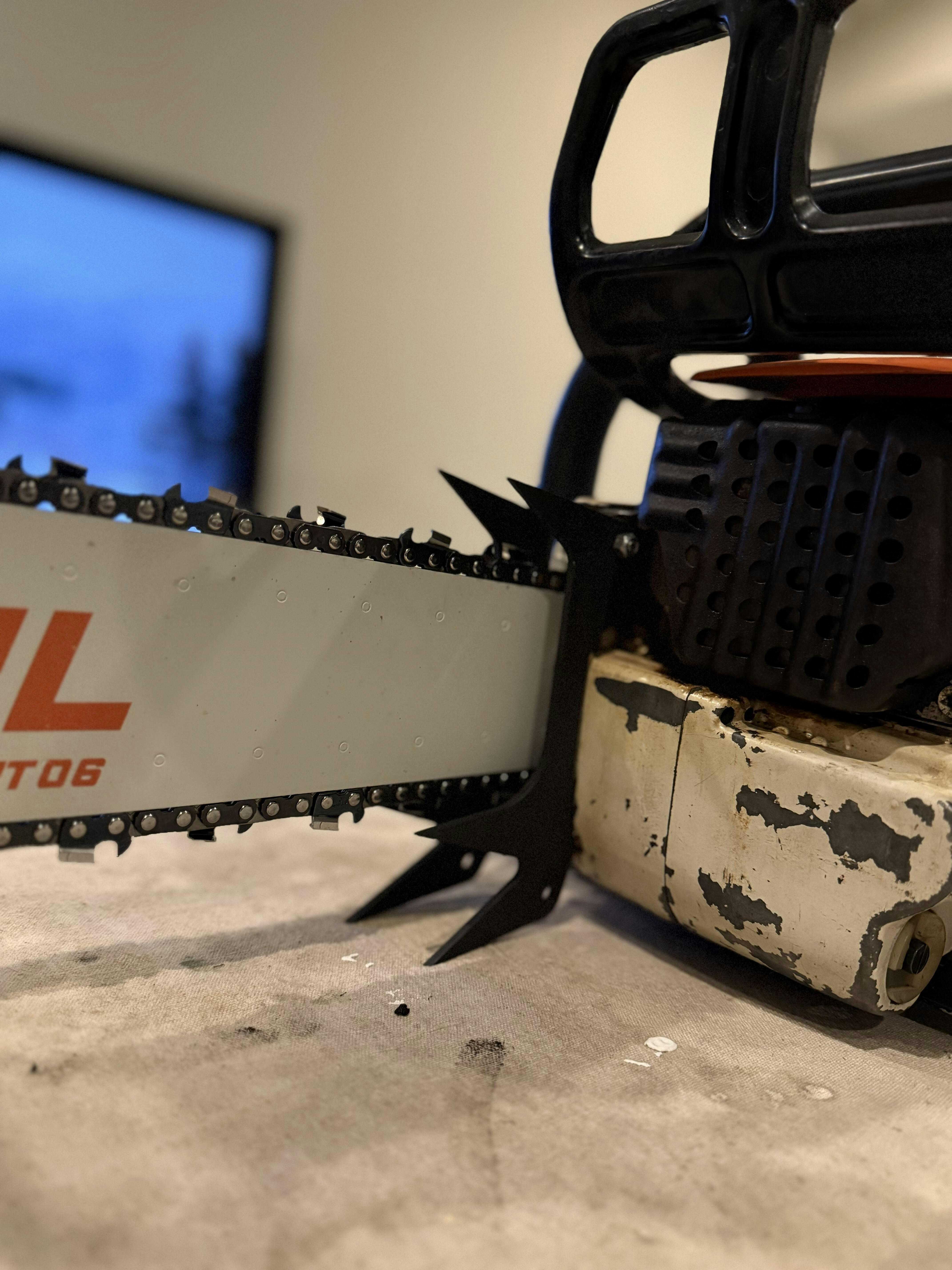 5-Point Professional felling dogs (bumper spikes) for Stihl® and Husqvarna® chainsaws. These heavy-duty bumper spikes (also known as 5-PT chainsaw felling spikes) give you better sticking power and leverage in thick-barked trees. Made from 1/8" heat-treated steel, these 5-point felling dogs for chainsaws are built to withstand intense pressure, helping you stay in control. Sold as a set (inside and outside dogs), they are a vital addition for any professional chainsaw user.
