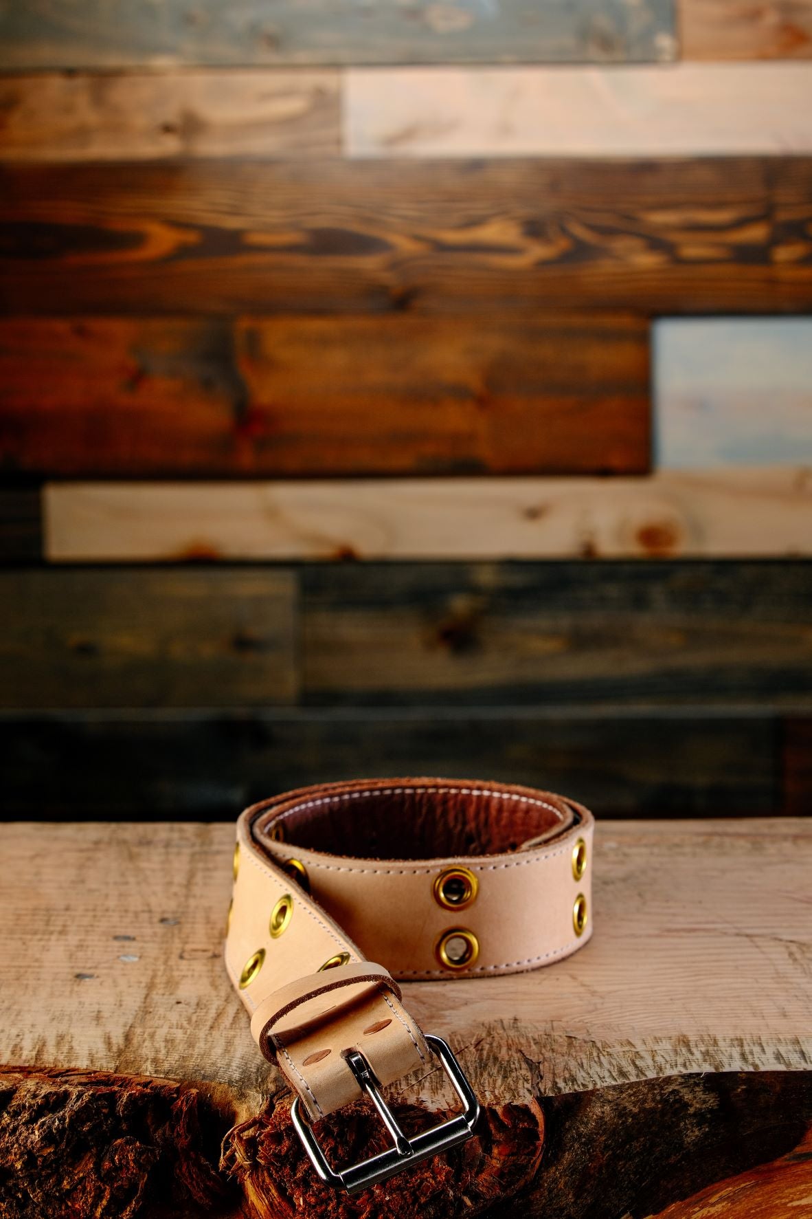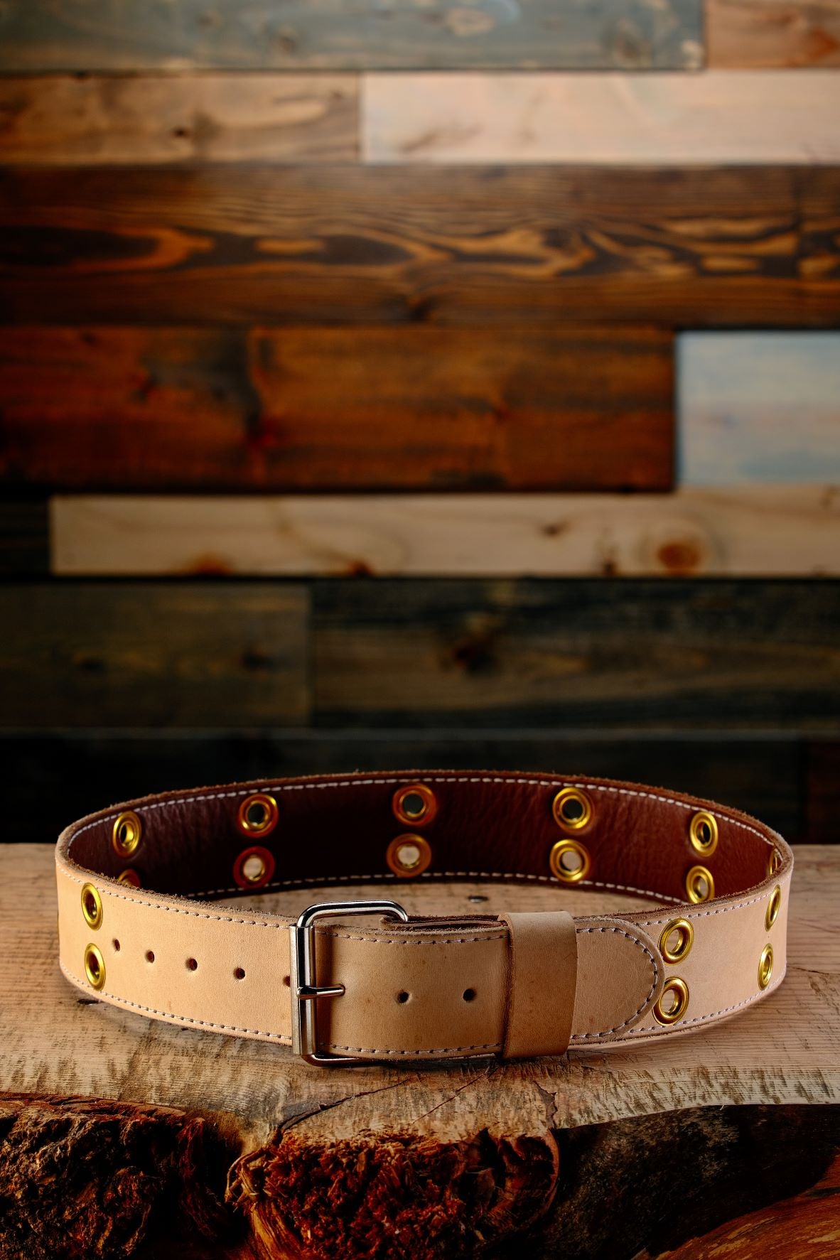 Belt is 2" in width and created from two pieces of vegtan leather sewn together (Small, XL, and 2XL sizes only). Interior is soft brown and exterior is light tan.